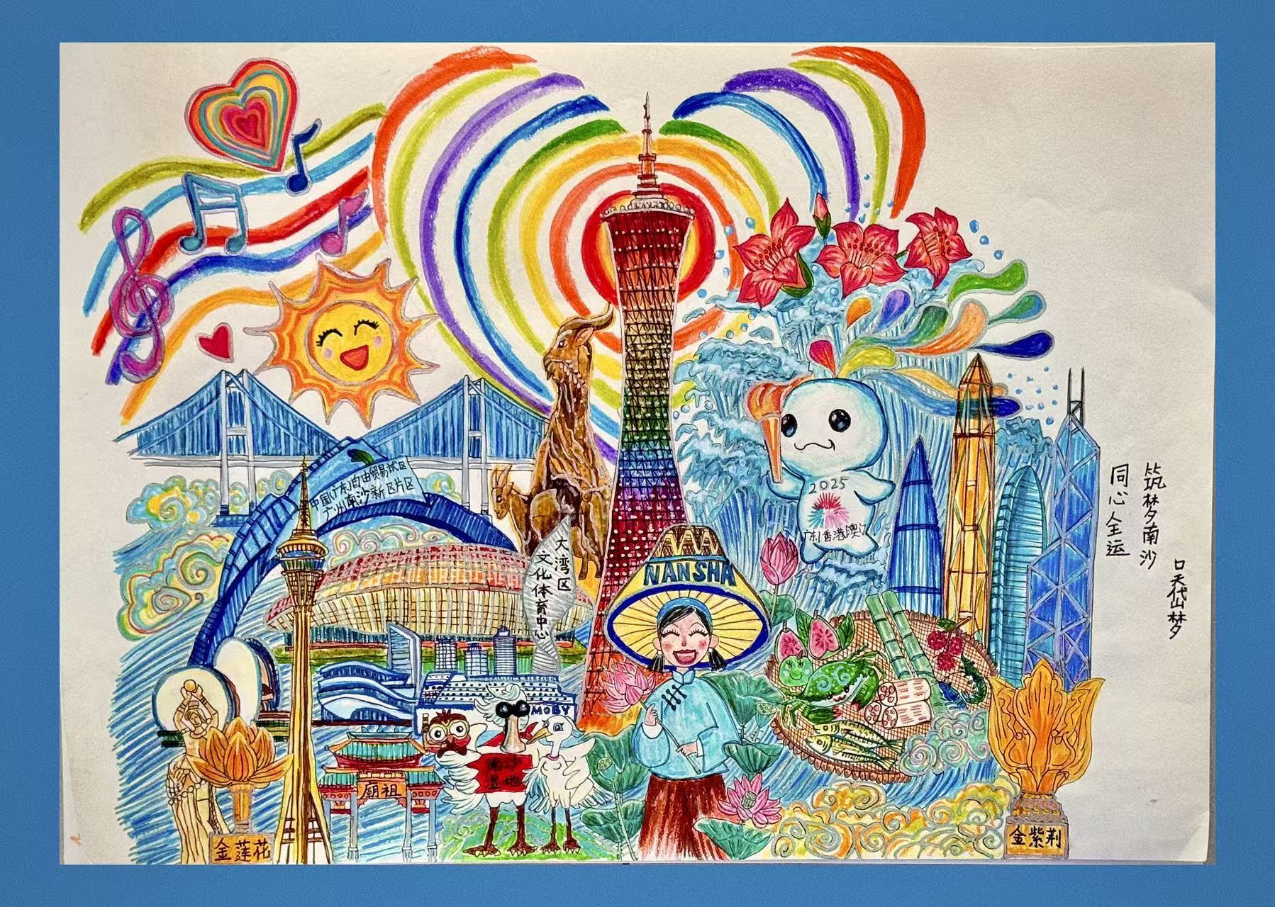 在吴岱梦的画作中,描绘了她在生活中的所见所闻:以南沙为中心画了一个“同心圆”,广州塔像个“爱心发射器”,把彩色的爱心从广州传到南沙,再送到湾区其他地方;画中还有碧波荡漾的湿地、飞舞的白鹭,满是疍家风情的生活气息,香港的金紫荆和澳门的莲花围绕着南沙,描绘出三地融合共生的美好图景。