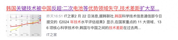那时的二次电池领域,是韩国在五十项国家战略技术中唯一能够傲视群雄、甚至大幅领先中国0.9年的最后堡垒。