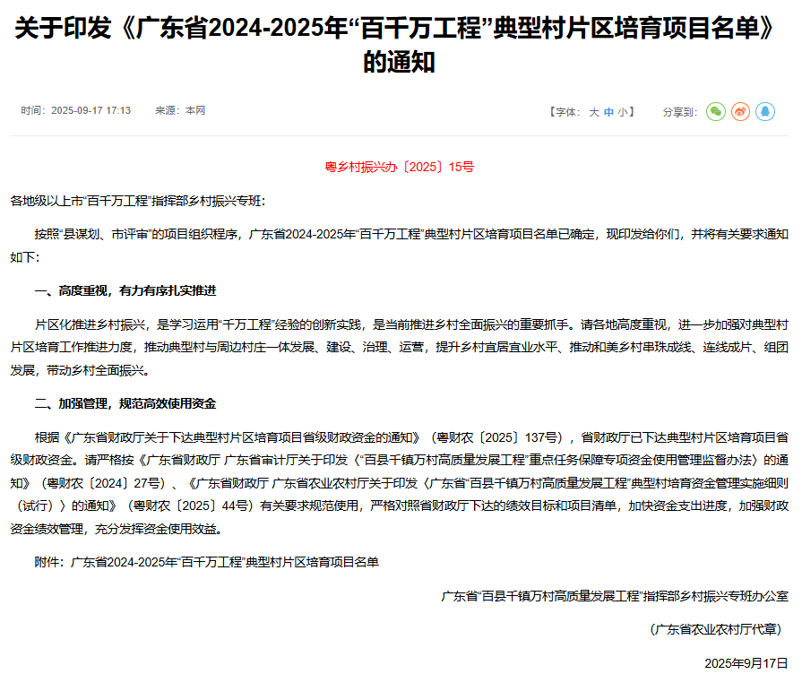 近日,广东省农业农村厅官网发布关于印发《广东省2024-2025年“百千万工程”典型村片区培育项目名单》的通知,发布了《广东省2024-2025年“百千万工程”典型村片区培育项目名单》,在全省培育25个典型村片区项目股天乐,清远市清城区典型村片区在列。