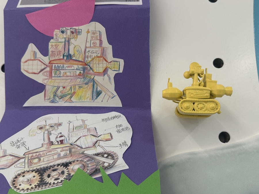 有意思的是,走出虚拟空间,孩子们还能带着对宇宙的畅想,自己设计探索宇宙的工具,画成图纸,并通过3D打印,让想象变成现实,做成冰箱贴贴在自己的作品旁。宇宙中太空垃圾增多怎么办?有人给飞船增加了磁铁和强力机械手臂来帮忙。现在的火星车是为了去探寻新的生存空间,而孩子们想得更远——万一哪天我们搬去了火星,那火星上的自动售货机必须得有一个。