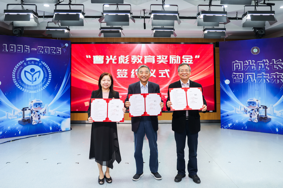 小工程师们还获得了来自大工程师们的礼物——30年前,曹光彪先生慷慨捐款建校,并成立曹光彪教育奖励金;昨天,第十四届全国政协委员、曹光彪先生之子曹其东(下图中间)再度捐资500万元。